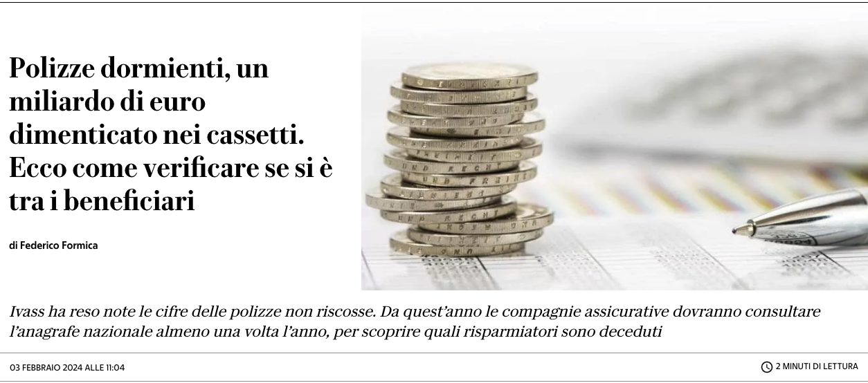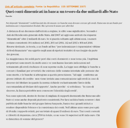 La risposta è sconcertante. Solo in Italia, 750.000 immobili abbandonati, oltre 1 miliardo di euro immobilizzato nelle compagnie assicurative, e più di 2 miliardi di euro dimenticati nei conti bancari.